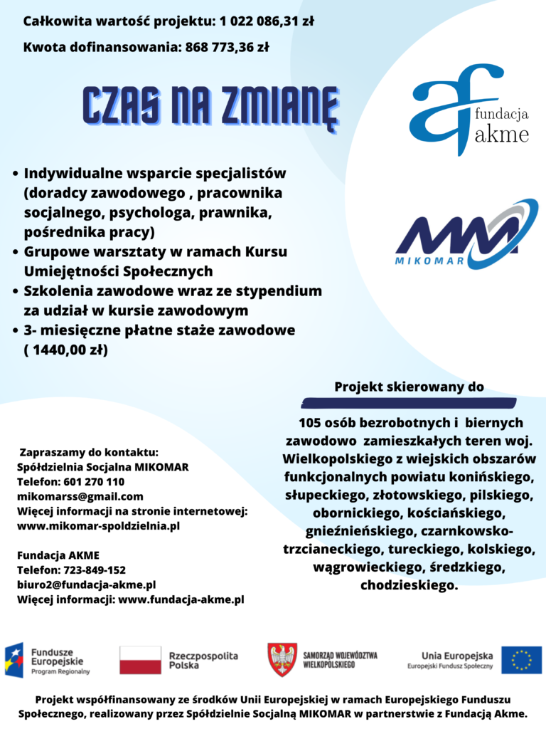 Projekt współfinansowany ze środków Unii Europejskiej w ramach Europejskiego Funduszu Społecznego, realizowany przez Spółdzielnie Socjalną MIKOMAR w partnerstwie z Fundacją Akme.